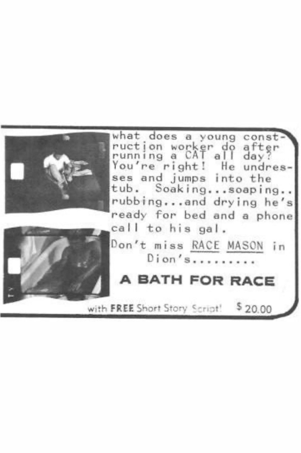 0 minWhat does a young construction worker do after running a CAT all day? You're right! He undresses and jumps into the tub. Soaking...soaping...rubbing...and drying he's ready for bed and a phone call to his gal.