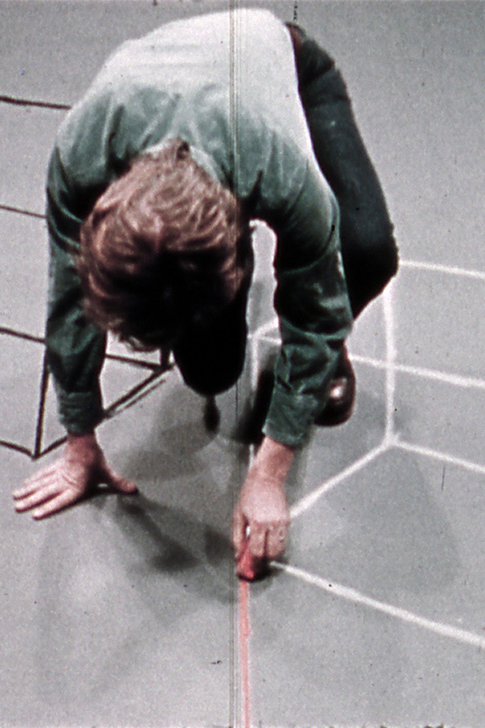 Cube and Room Drawings begins with a view looking down at an angle toward grey paper covering the floor. A performer enters from the back of the scene and begins drawing lines on the floor. The lines are the beginning of a drawing of a distorted cube. The performer leaves the scene. The paper begins to rotate on the floor. As the paper rotates the cube gradually becomes correctly oriented, as if it were drawn on a vertical piece of paper. The performer enters again and draws another cube that corresponds to the perspective of the other cube. After leaving and re-entering the performer draws red receding lines on the floor. He leaves and the paper rotates and the red lines become a grid that corresponds to the vertical screen. The film continues with several additional actions that continue this theme. Preserved by the Academy Film Archive in 2012.