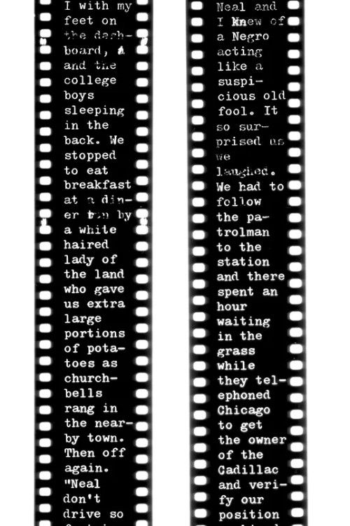 14 minIf Jack Kerouac wrote his legendary novel On the Road on a long paper scroll, why not do it on a long 35mm film roll as well? By re-typing the complete book –with the use of 35mm black leader instead of paper on a typewriter– this project attempts, among other things, to convert Kerouac’s romantic rhythmic writing method onto a cold and mechanical transcription in order to give the work new possibilities and readings that, when projected at 24 frames a second, although they do emphasize Kerouac’s intentions of immediacy, they transform the text into illegible blotches of letters that demystify and question language at its most elemental levels.